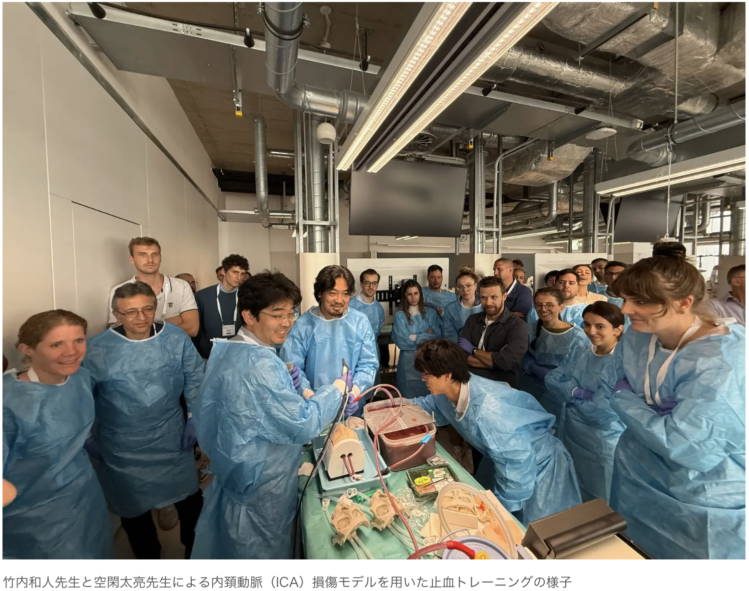 様々なデバイスを用いた実践的なトレーニングを通じ、参加者の真剣な姿勢や探究心に触れ、教育に携わる立場として大きな刺激を受けました。特に内頸動脈破裂モデルが多くの参加者の注目を集めていたのが印象的でした。実際の手術現場では内頸動脈破裂を経験することは極めて稀であり、通常の臨床では直接学ぶことが難しい状況です。しかし、モデルを通じて予期せぬ事態への対応をシミュレーションし、冷静かつ迅速な判断力を養うことができる点は大変意義深いと感じます。