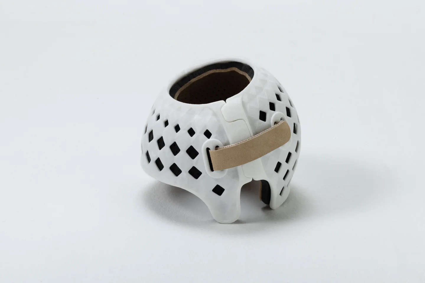 当社製ヘルメット「Qurum Fit」は、3Dスキャン計測と3Dプリンティングを基盤とした完全オーダーメイド設計により、通気性・軽量性・清拭性(水洗い可能なクッション)といった装着継続性を高める要件を満たしながら、成長に合わせた段階的なインナークッションの調整が可能です。